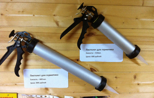 На фото – пистолет для нанесения герметика в швы между бревнами.